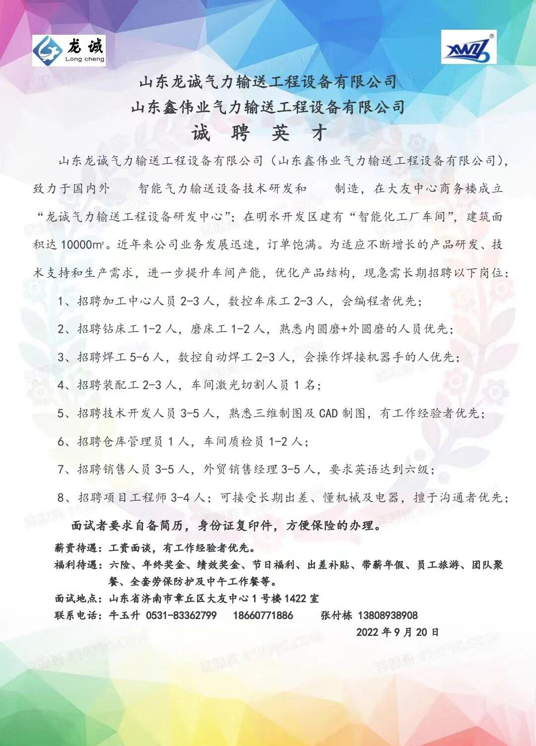 山東秀色APP直播氣力秀色直播IOS工程設備有限公司(山東鑫偉業氣力秀色直播IOS工程設備有限公司),致力於國內外智能氣力秀色直播IOS設備技術研發和製造,在大友中心商務樓成立 “秀色APP直播氣力秀色直播IOS工程設備研發中心”; 在明水開發區建有“智能化工廠車間”,建築麵積達10000㎡。近年來公司業務發展迅速,訂單飽滿。為適應不斷增長的產品研發、技術支持和生產需求,進一步提升車間產能,優化產品結構,現急需長期招聘以下崗位: