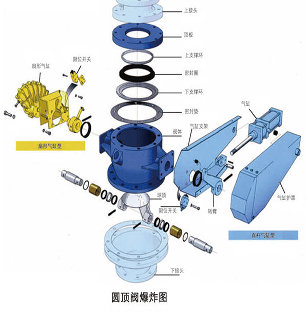 穹形閥芯在密封圈鬆弛(非膨脹)狀態下閉合於密封密封圈下方,在密封圈與穹形閥芯間形成一定間隙。受穹形閥芯關閉動作的作用,並取決於料性,某些物料將穿過或進入該間隙。